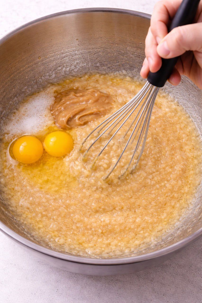 Add the wet ingredients: sugar, eggs, peanut butter, and melted butter. Mix thoroughly by whisking.