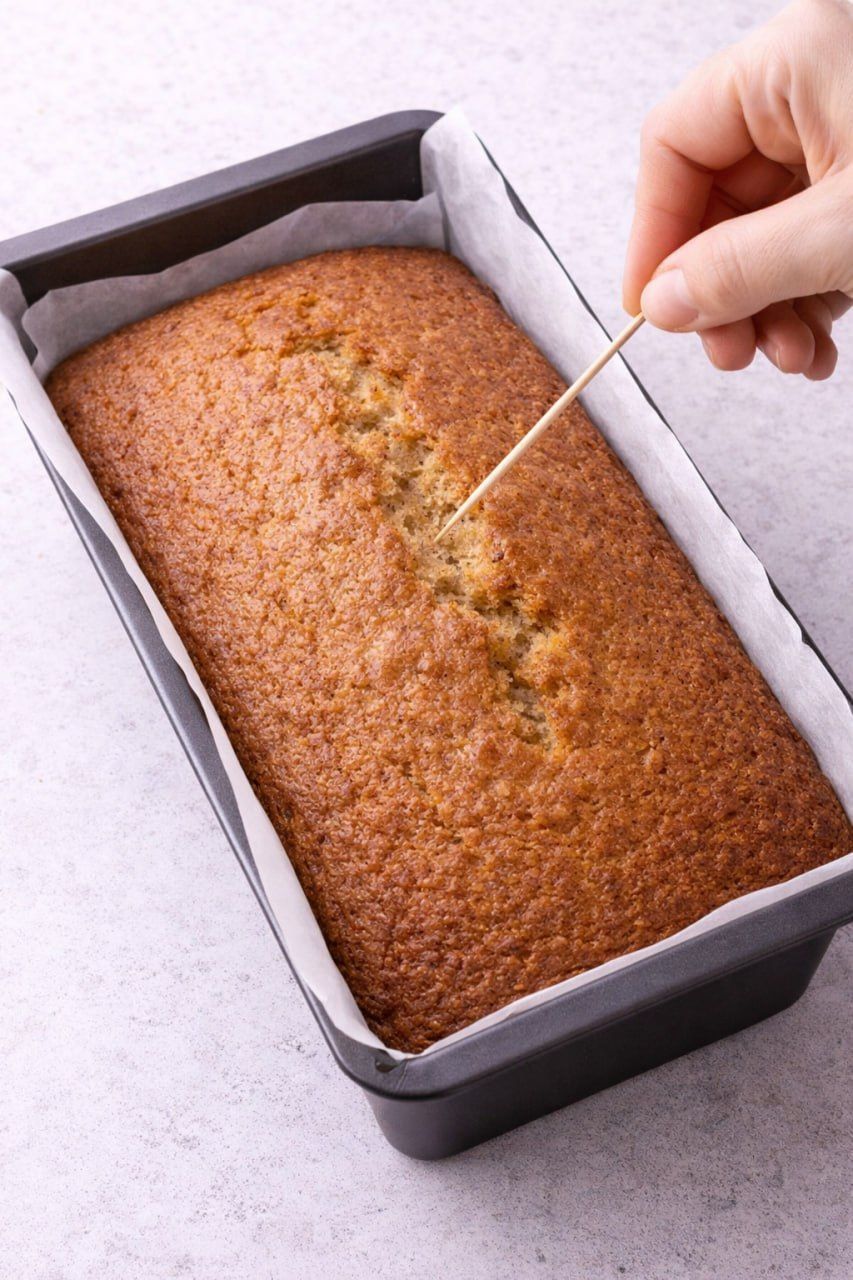 Insert a toothpick or skewer into the centre. If it comes out clean or with just a few moist crumbs (not wet batter), it's done.