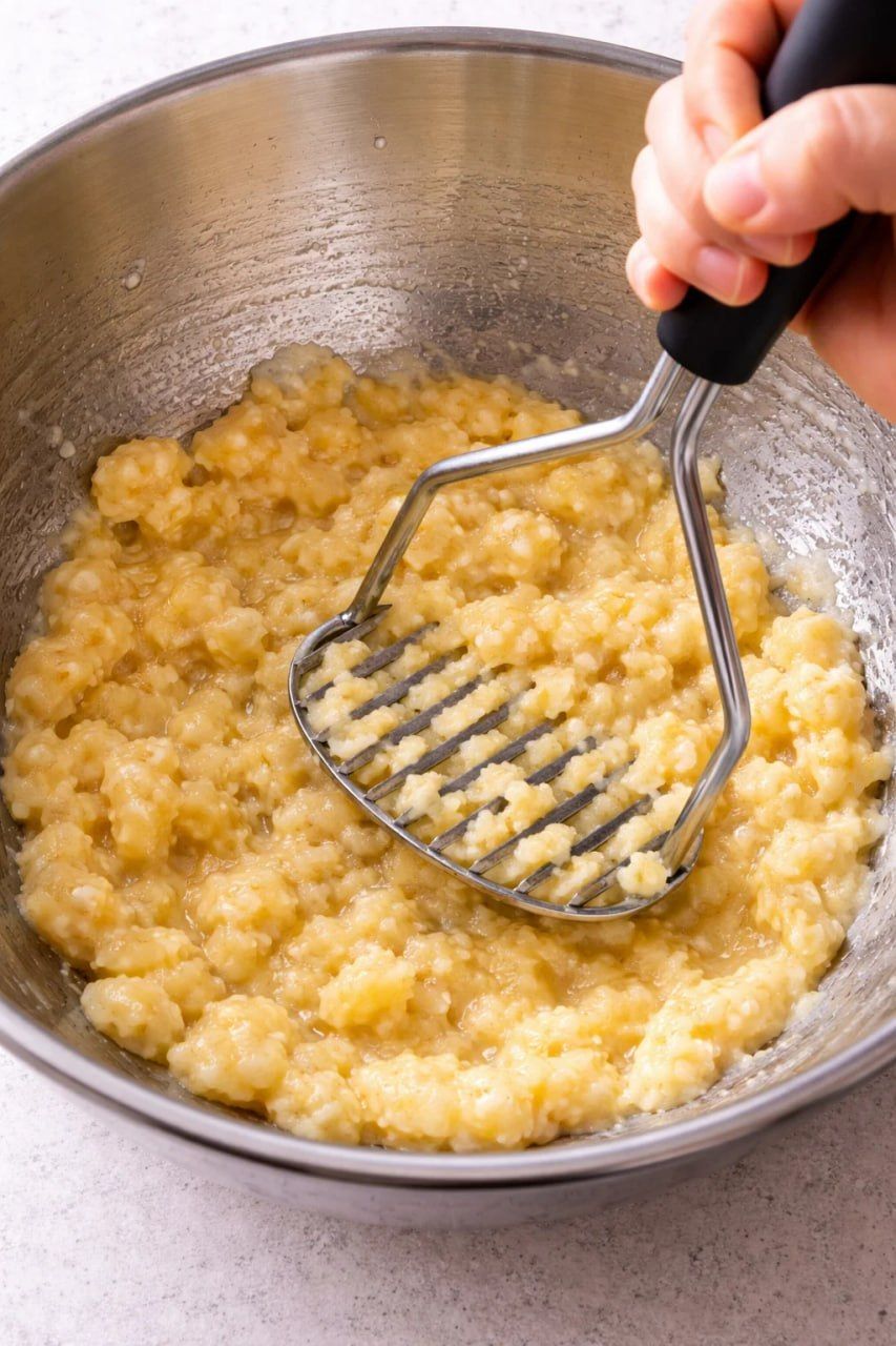 In a mixing bowl, mash the bananas until they are smooth. The more overripe, the better!