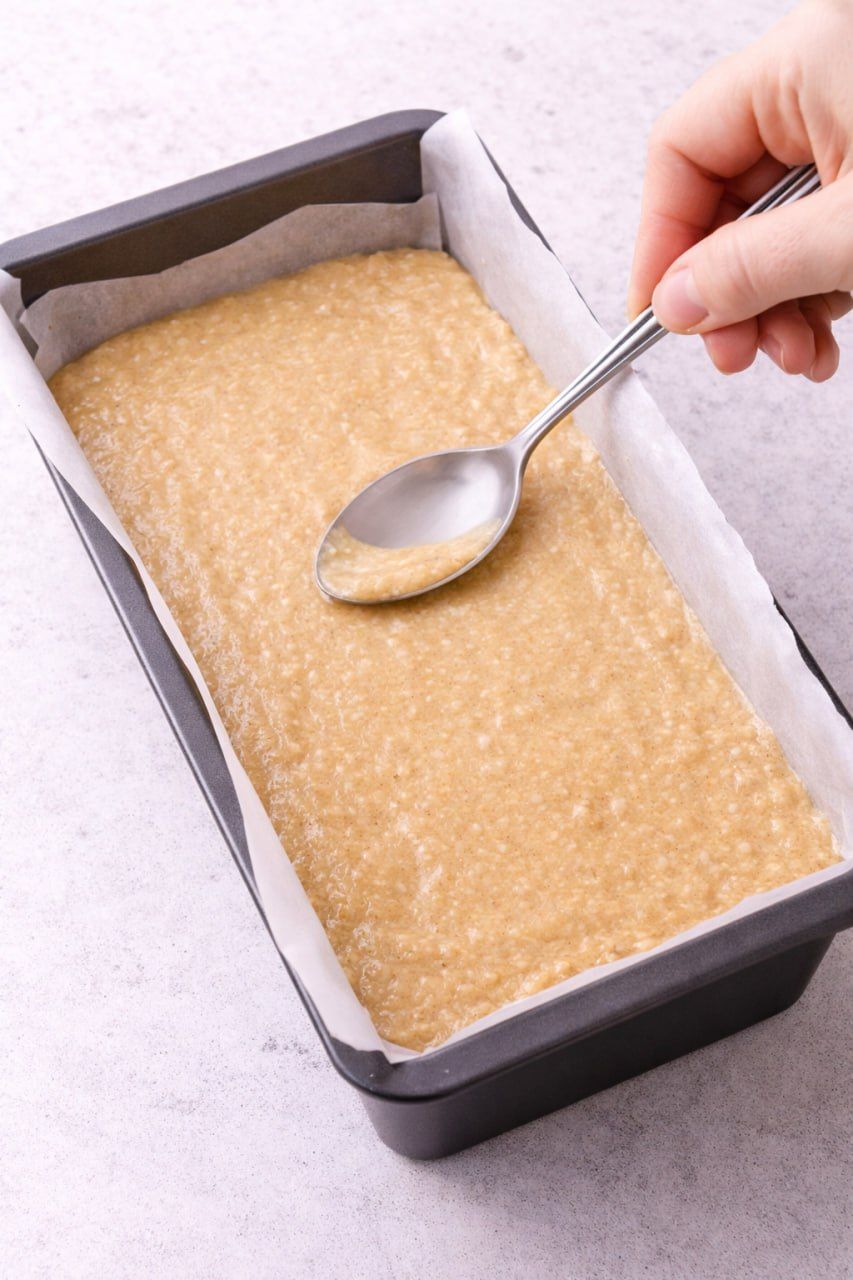 Using a spoon to smooth the top, pour the batter into the prepared loaf pan.